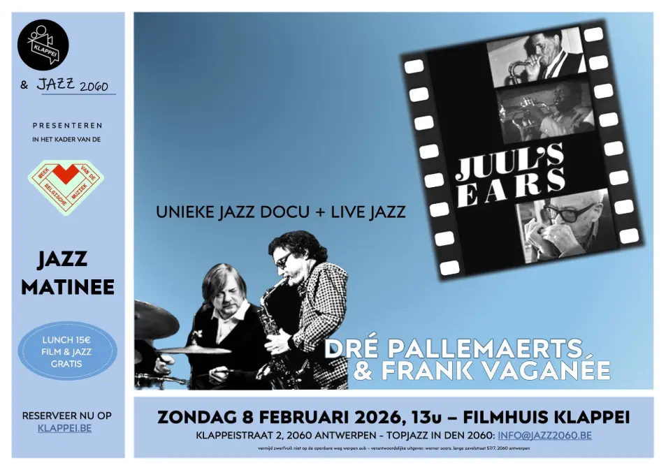 Zondag 8 februari in Klappei wordt een hele speciale Jazz Matinee, met om 13u een lekkere lunch, waarna om 14u de unieke documentaire Juul’s Ears over meer dan een halve eeuw legendarische Hnita jazzclub, en als toetje om 15u live jazz met toppers Dré Pallemaerts en Frank Vaganée.